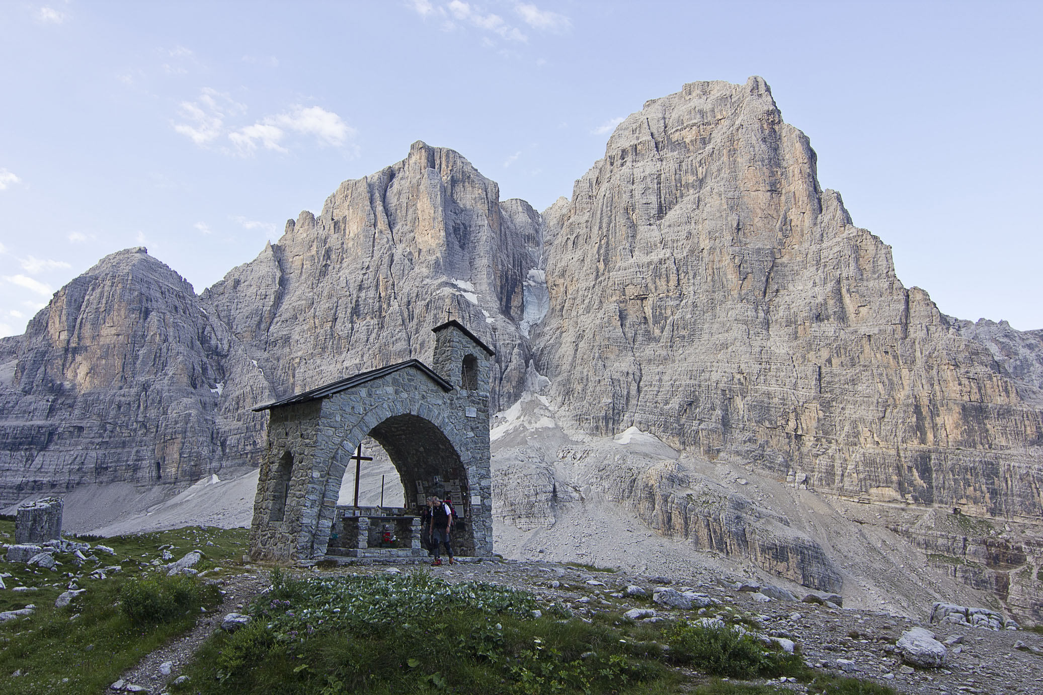 Our first stop for the trip around the Alps was the Italian Dolomites where we were going to do some via ferratas for a couple of days. We slept in this beautiful hut, Rifugio Brentei. The little construction you see behind it and in the second photo is in fact a shrine filled with obituaries of mountaineers and climbers who lost their lives around these places.