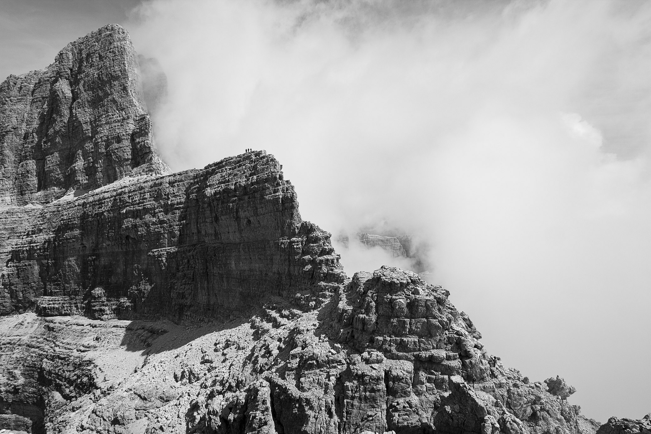 The three little dots you see in center is where we were going, via that edge. It’s a bit daunting when you first see it, I’m not gonna lie, but it’s so fun to actually do it. This was the most impressive sight of the day, hands down, especially with the clouds creeping up behind the ridge. I shot the same three guys on the way down from there, seen on the second photo.