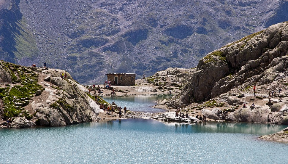I just love the four layers of this shot 🙂 The bluish-green/turquoise color of Lac Blanc (named after the infamous peak, naturally) is some sight early in the morning… it just beckons you to dive in after walking for a few hours up to it. The spectacular reflections of the opposing 3,500+ meter peaks (Mont Blanc, standing at 4,810 meters, is the one furthest to the right) were gone 10 mins later when the wind picked up. Lucky us.