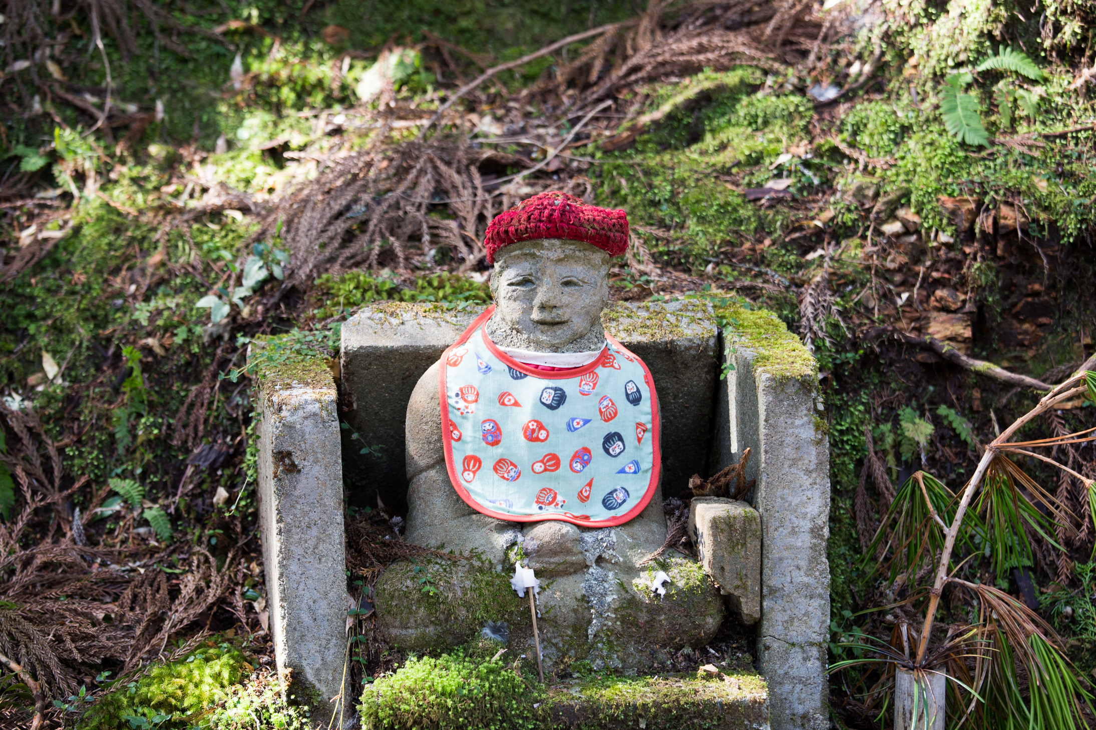 One of over 50,000 Jizo statues in Okunoin. There is a tradition for one to place a red bib on them, thus asking Jizo Bosatsu (a bodhisattva, believed to be the protector of children in the afterlife) to watch over one’s deceased child and act as a surrogate parent. That’s how the custom started, though nowadays it has become quite popular so you can see many other statues apart from children also now wrapped in bibs.
