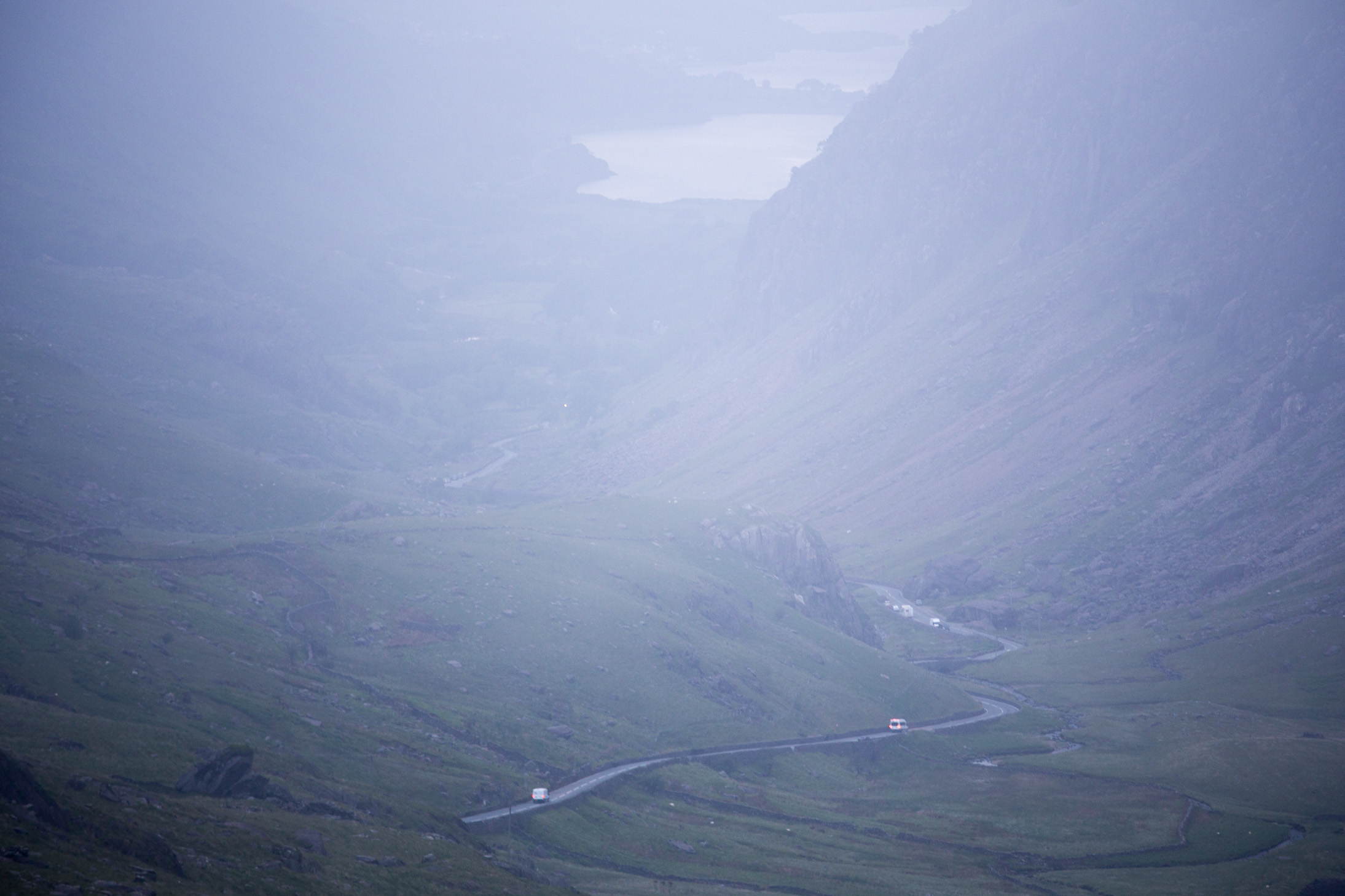 The Llyn Peris lake and the road that leads up to the car parked where we got dropped off around 4.45am. The morning mist was actually quite welcome as it kept things cool for the first ascent.