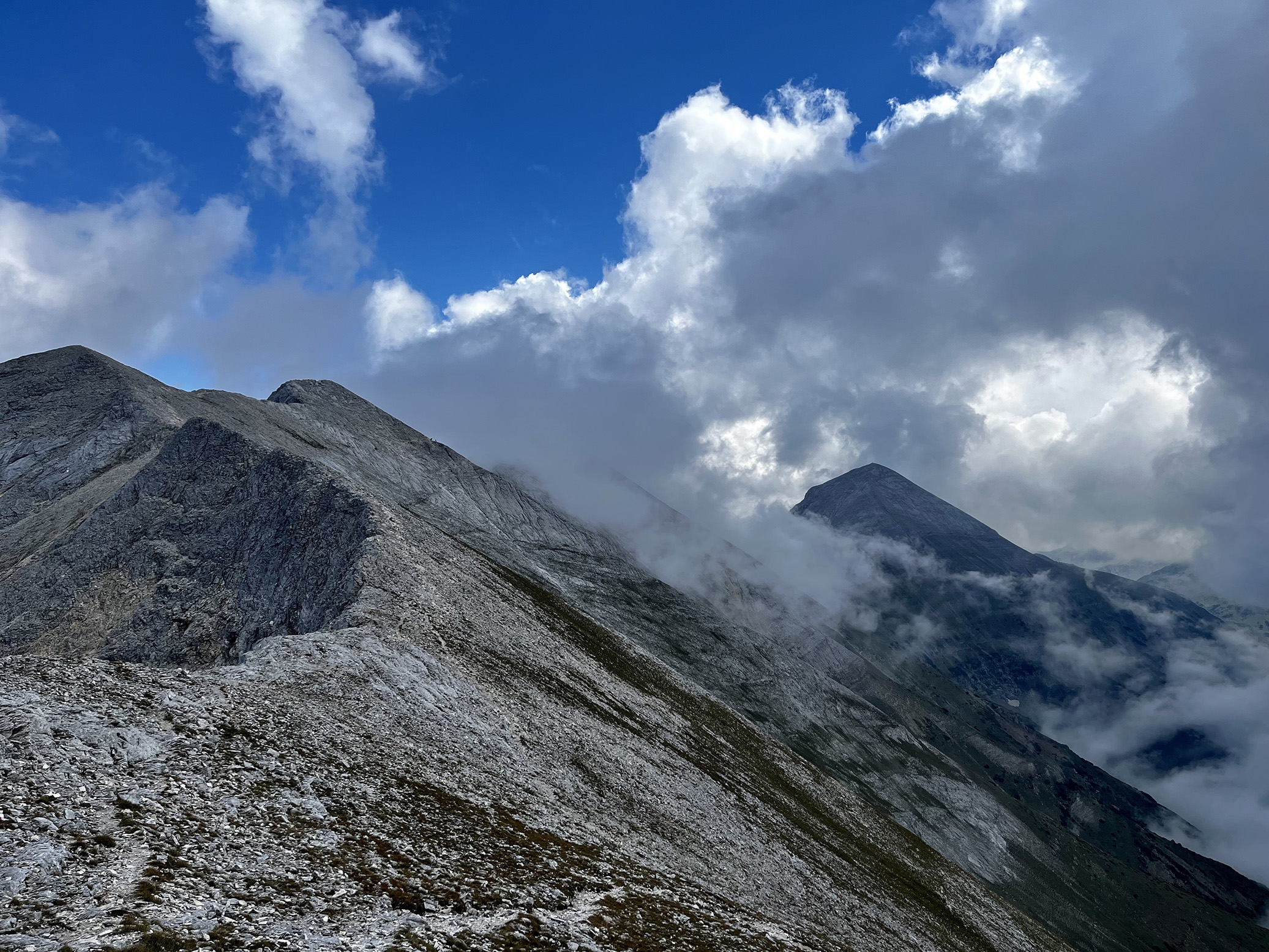 Aaaand I’m at the top! Almost 😒 Gotsev Peak is the one in the clouds on the other side, just need to do follow the ridge line and get to it. Simple, right? Technically, yes — but after days an days of tons of walking, having just done a 1,000m climb up and really feeling like you deserve a break, this last hurdle is just a little annoying 😄